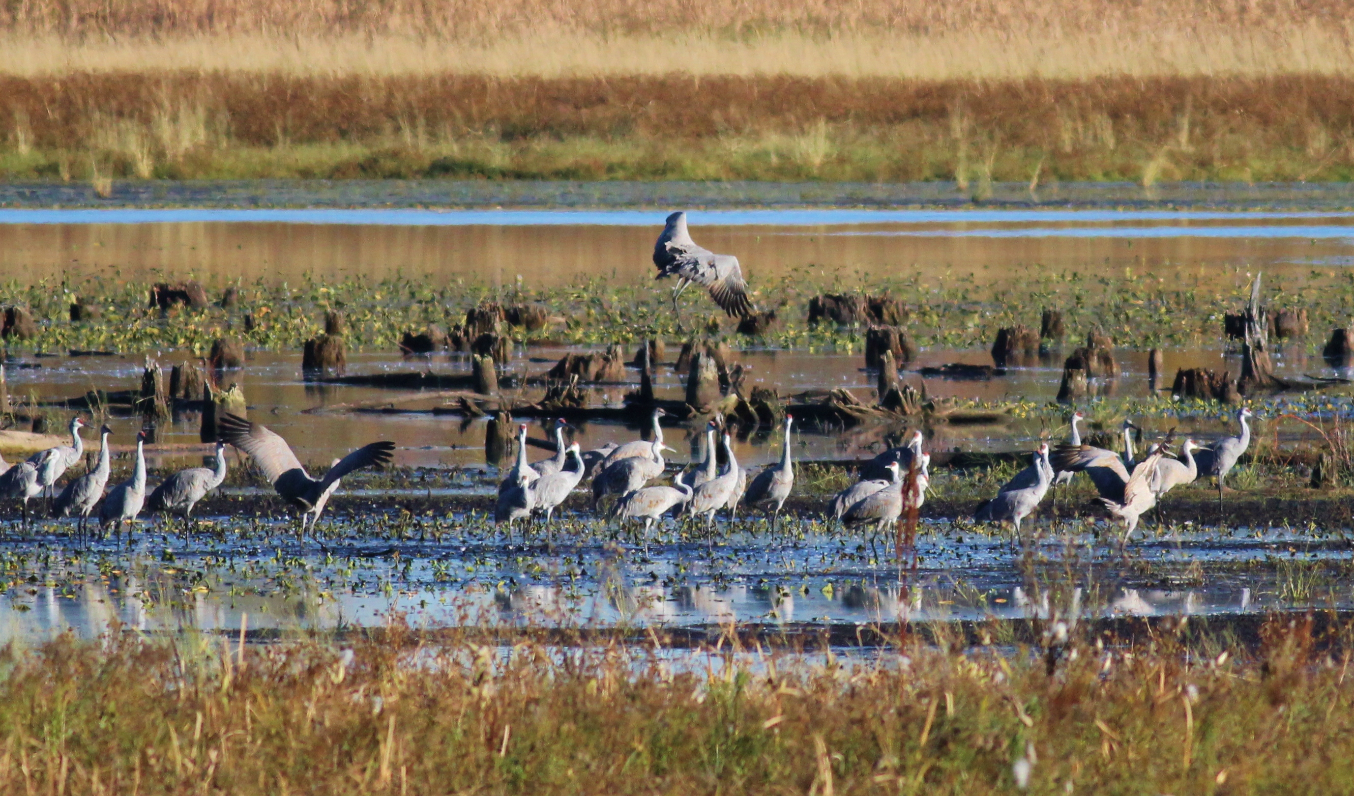 We had tickets to a special dinner event that night (more about that shortly), so we decided to go to the sanctuary beforehand to watch the evening fly-in. (Cranes come in to the marsh each evening before dusk to roost, then leave again in the morning.) We got there at 5 pm and I was very surprised to see at least a thousand cranes already populating the marsh. I couldn’t even begin to count all of them, but I’m sure there were more than a couple thousand by the time we left around 6:30. They were a hundred yards away from the closest viewing areas, so I was disappointed not to be able to get close-up photos. But I took a few shots of the large groupings anyway, and shot the smaller groups as they flew over our heads on their way down into the marsh.