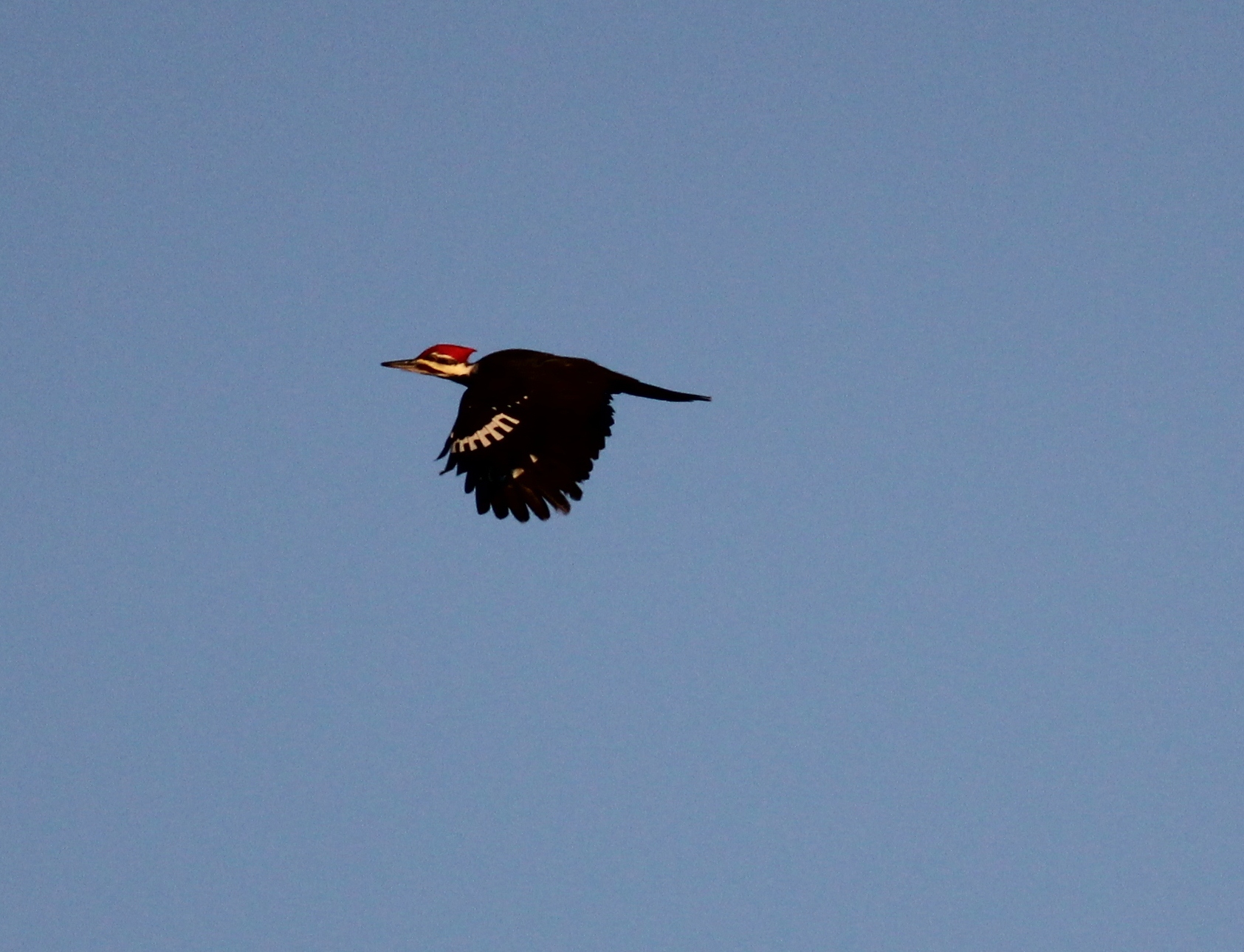 And lest I forget, there were other great birds in the area that night too. We watched two Bald Eagles soaring around a few times, and got to witness a beautiful Northern Harrier soaring low over the marsh hunting for his dinner. There were bunches of Robins, of course, and a few small songbirds that we didn’t pay much attention to. But I kept taking pictures of anything that flew past, even if I didn’t know what it was at the time. Imagine my surprise when I got the photos uploaded and discovered that I’d shot a Pileated Woodpecker flying past! This is a great bird that I don’t get to see often enough. And I also found a life bird in one of the photos — a Ring-necked Pheasant was perched on a dead tree way back in the marsh. I’ve become used to using the computer to zoom in on trees looking for little birds, but this one was so obvious I wondered how I hadn’t noticed it when I was scanning the marsh with my binoculars. What a fun 24 hours this was!