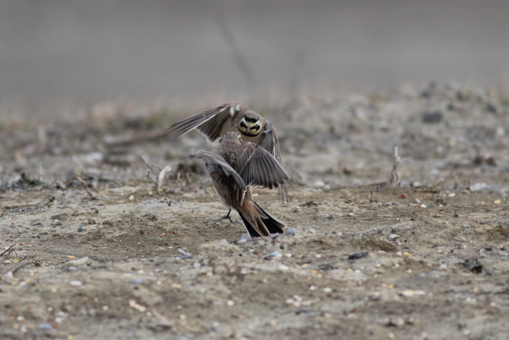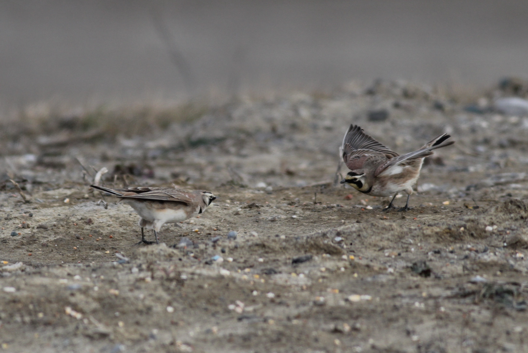 I spent a half hour watching five Horned Larks rummaging around on the littered ground for food. They’re such great birds, with their little black “horns” and their sweet tittering songs. They kept hunkering down in little depressions to get some shelter from the strong wind (and I stayed in the car for the same reason), but I still managed to get some decent photos.