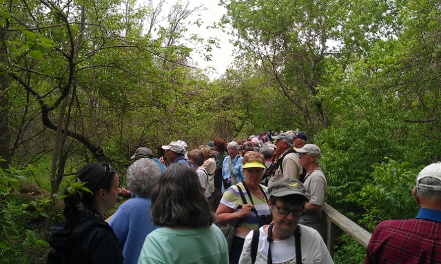 As a highly-sensitive person (HSP), I have a strong aversion to crowds and noise. Some people are stimulated in a positive way by being around lots of other people, but I have the exact opposite experience. After spending time at a large social function, I usually feel very tired and emotionally drained. We HSPs take in so much more information in any given situation than most people that our brains just get overloaded with stimuli. Because of this, I’ve learned to orchestrate my life so that I have lots of quiet time for recuperation and reflection on my experiences. Knowing all of this, you might wonder why I would voluntarily go to a birding festival where the most popular birding spot is a narrow boardwalk that gets so crowded you sometimes have to push your way between people. (The photo to the left is only a medium-sized crowd — it gets much worse in spots where a really good bird is spotted!)