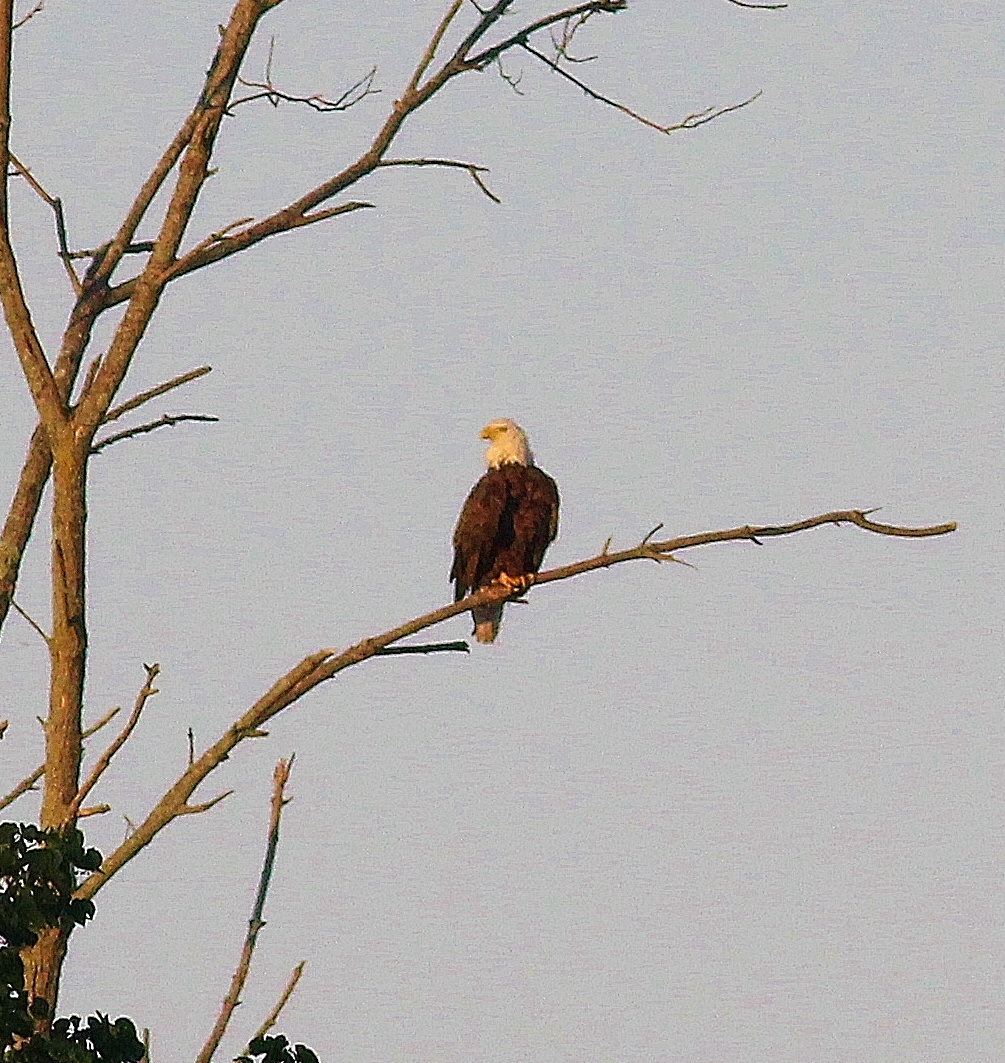 As the sun got closer to the horizon I started to get chilly, so left the remaining three people in our group and and headed back to my car. On the way back I looked back toward the eagle nest from another vantage point and spotted the other adult sitting on a branch out in the open. I think a Bald Eagle looks majestic no matter how blurry the photo….
