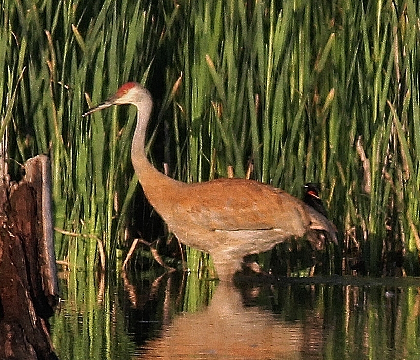 The cranes slowly worked their way down into the pond, emerging from the vegetation so we got beautiful full-body views of them in the evening sun. And as you can see in the picture here, one of the blackbirds wasn’t finished with guard duty. It was basically riding on the crane’s backside as he walked through the water. The blackbird would flutter up and come back down, and I couldn’t tell if it was actually pecking the crane. But then it just sat down and the crane didn’t seem to mind it hanging on like that. Such an odd behavior. It reminded me of birds that eat insects off of elephants or bison — a tiny bird on a larger animal.