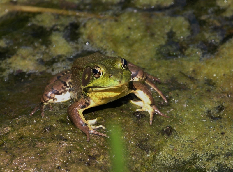After an hour or so trying to photograph those speedy fliers, it was a piece of cake to snap pics of the frogs in a nearby pond. I’m not proud to reveal the extent of my lifelong disconnect from the natural world by telling you that I’d never seen a frog with those big flat discs on its head before. At first I thought it had a button stuck to it…seriously, I had no clue. I now know that these are its ears, and if you tell anyone about my ignorance, I’ll say that I knew it all along….