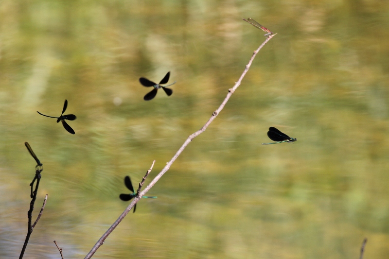Ebony Jewelwings - damselflies (800x533)I almost deleted this first picture because it wasn’t in focus, but then I realized it was still interesting. These are mostly Ebony Jewelwing damselflies (and one other type I’ll show you better below). They were swarming over the river at Wolcott Mill Metropark on a recent visit and I sat on a rock in the shade to snap a few photos of the aerial symphony they were creating. Isn’t the blurred background almost like an Impressionist painting? I love it.