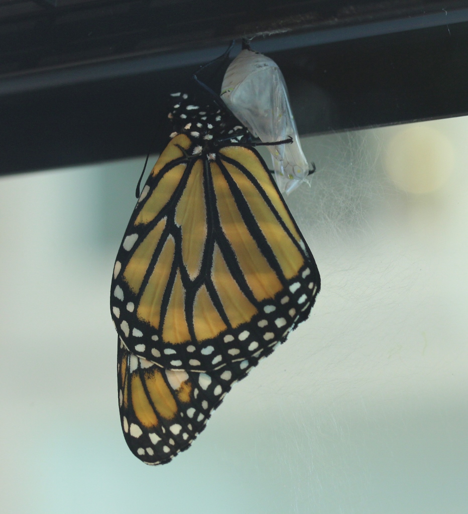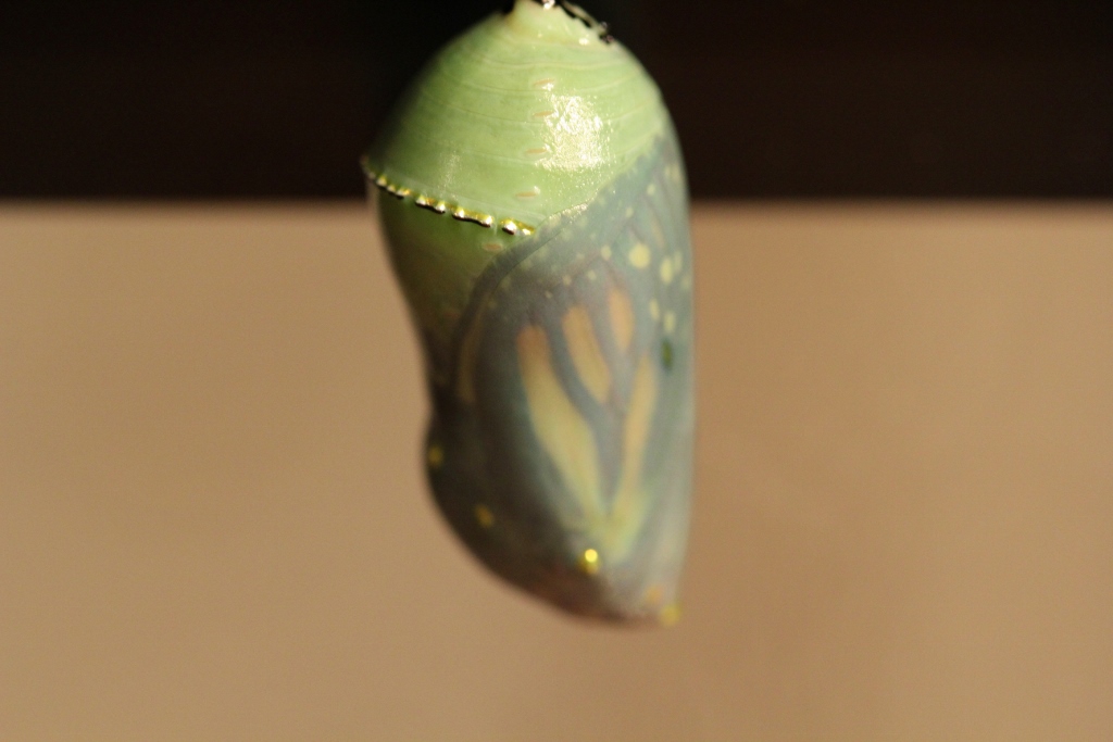 I watched in awe for a while after that. Even though she wasn’t moving at all, I just couldn’t get over the transformation I’d witnessed. I’d watched her evolve from a little microscopic egg on a milkweed leaf to a tiny little caterpillar, and then to a larger and larger caterpillar. And then she hung upside down and shed her skin, exposing the exquisite jade green chrysalis. And eventually–through some magic of biology that I can only comprehend very vaguely–out popped a butterfly so beautiful that I was speechless.