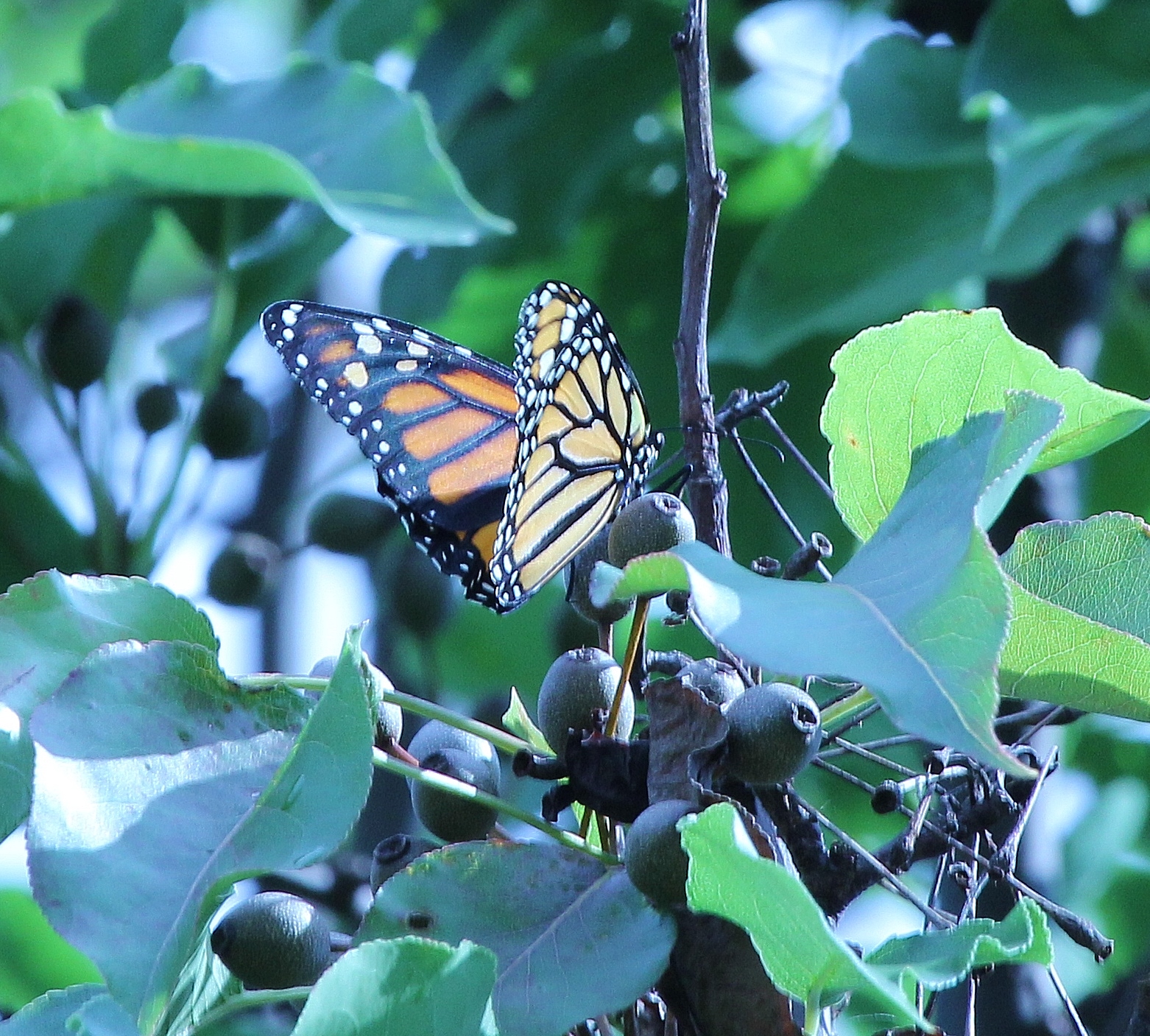 I watched her as she sat in the tree for probably 20 minutes or so. There was a fairly brisk breeze knocking her around up there, but she had a good grip and hung on through it all. Then I was distracted for a few minutes by a phone call, and when I turned back to look at her she was gone. It’s probably a good thing I didn’t see which way she went, because I might have felt compelled to chase her around like some sort of lunatic, reluctant to let her out of my sight. #MonarchMama