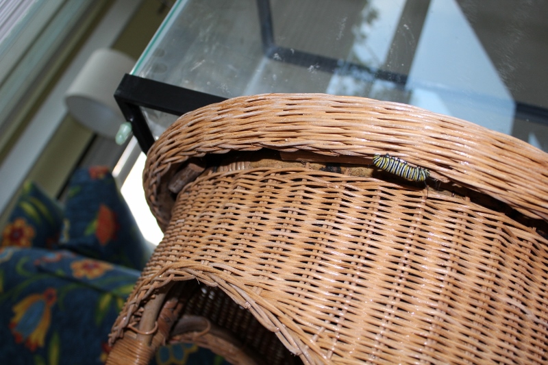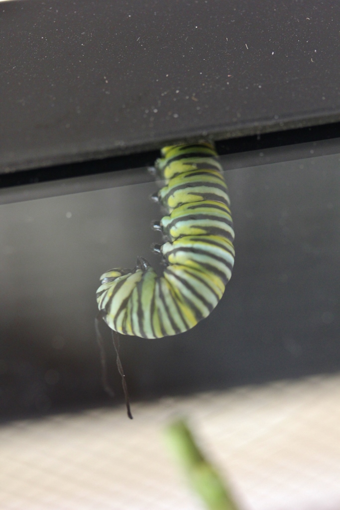Since that day I’ve released four more monarchs into the beautiful blue skies of Ohio. And today I still have a few more chrysalises in my aquarium. (Yes, I know that the plural of chrysalis is really “chrysalides” but I find that word awkward so I just use “chrysalises.”) A couple of the big caterpillars have managed to escape the aquarium when they’re ready to pupate. I’ve spent some panicked moments searching my sunroom for missing caterpillars, only to find them hanging under the table or on the bottom edge of the aquarium. The first thing I do each morning and each evening when I return from work is do a head count to make sure nobody is running loose where I might step on them. I guess I should get a better lid on the aquarium, huh?