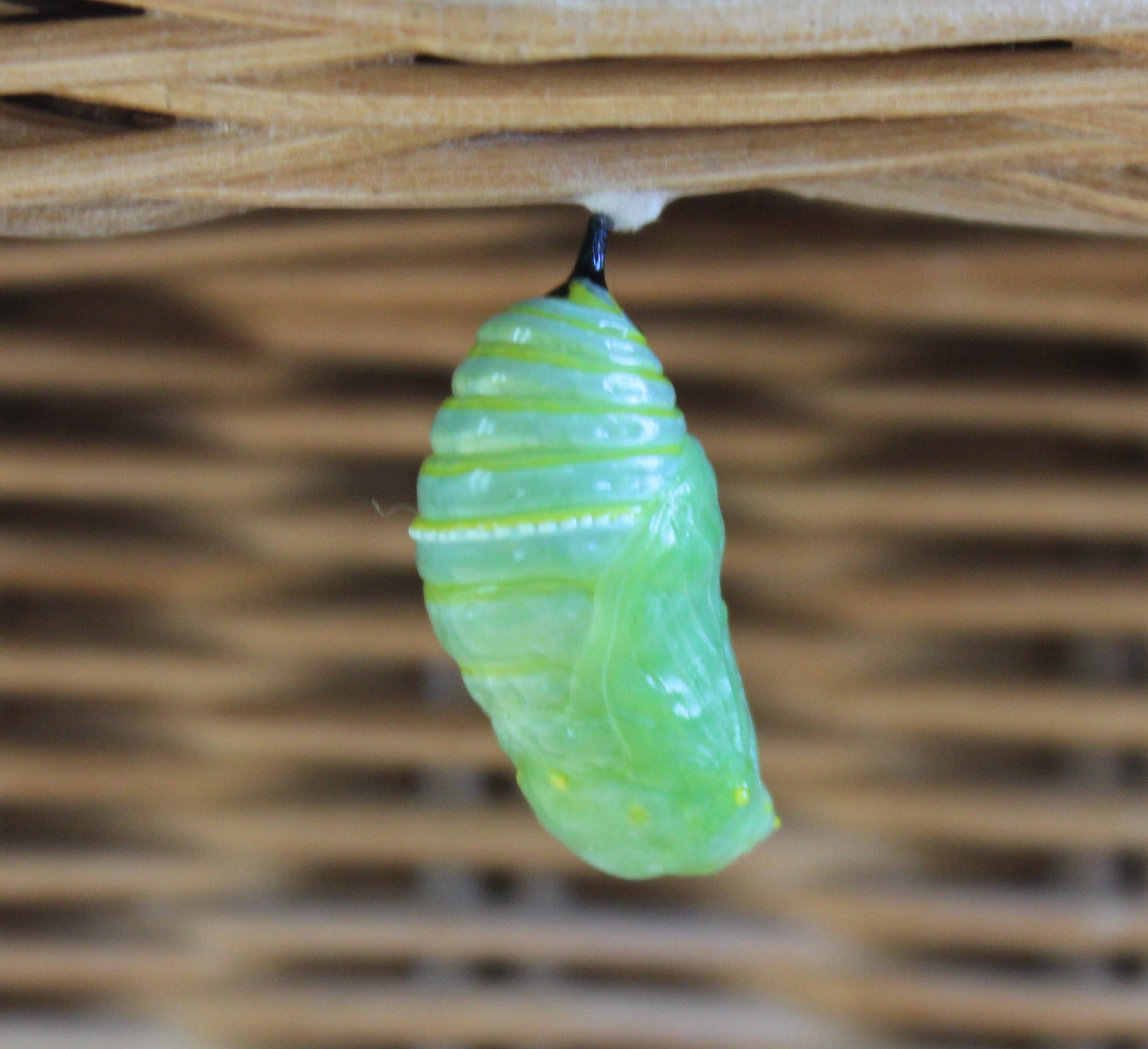 As soon as I got out of bed I rushed straight to the kitchen table…where the monarch was already out of the chrysalis. I was disappointed that I’d apparently just missed the moment of emergence, but also thrilled to see a moist, fresh butterfly just stretching its wings for the very first time.