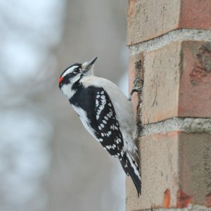 Downy Woodpecker on brick wall