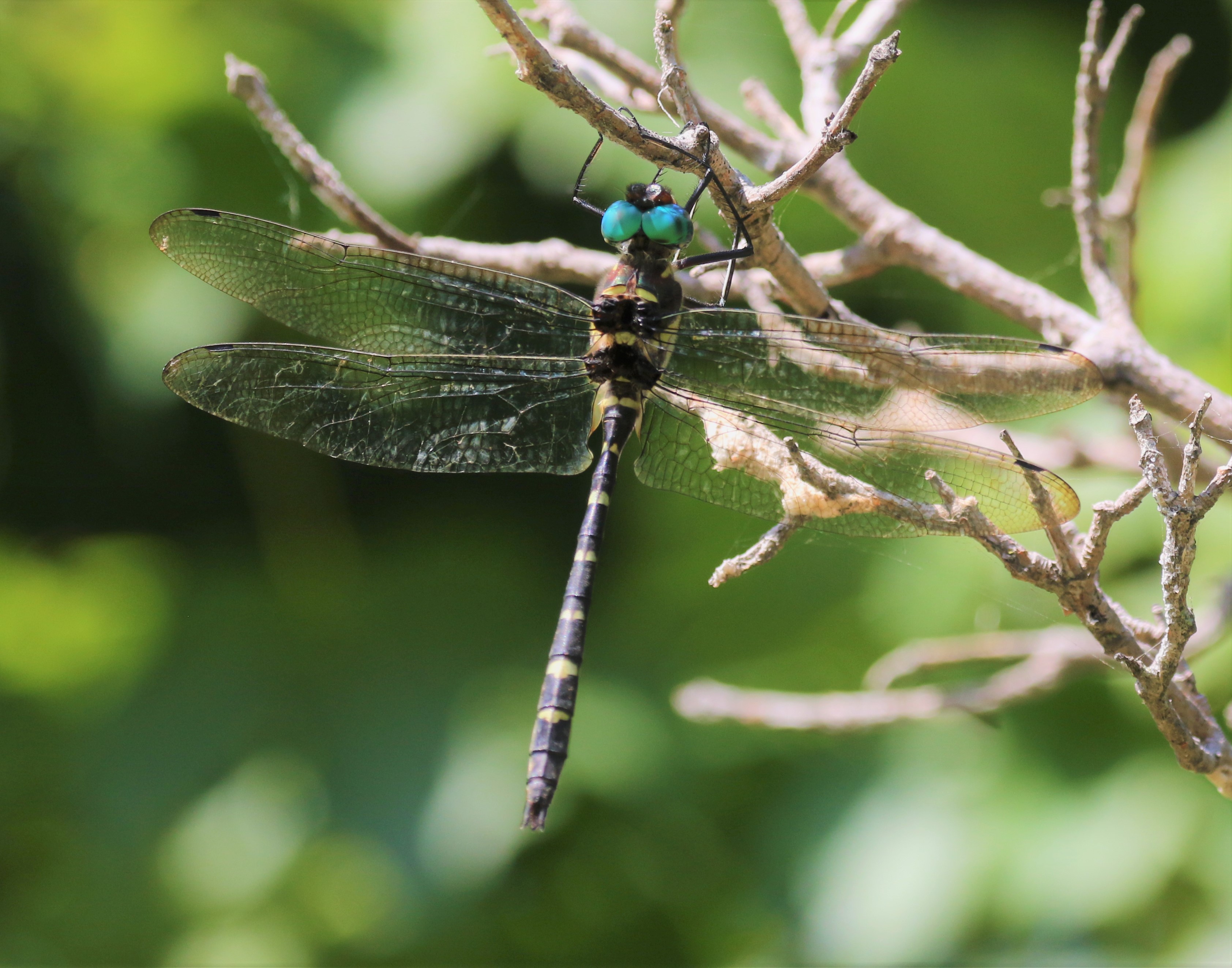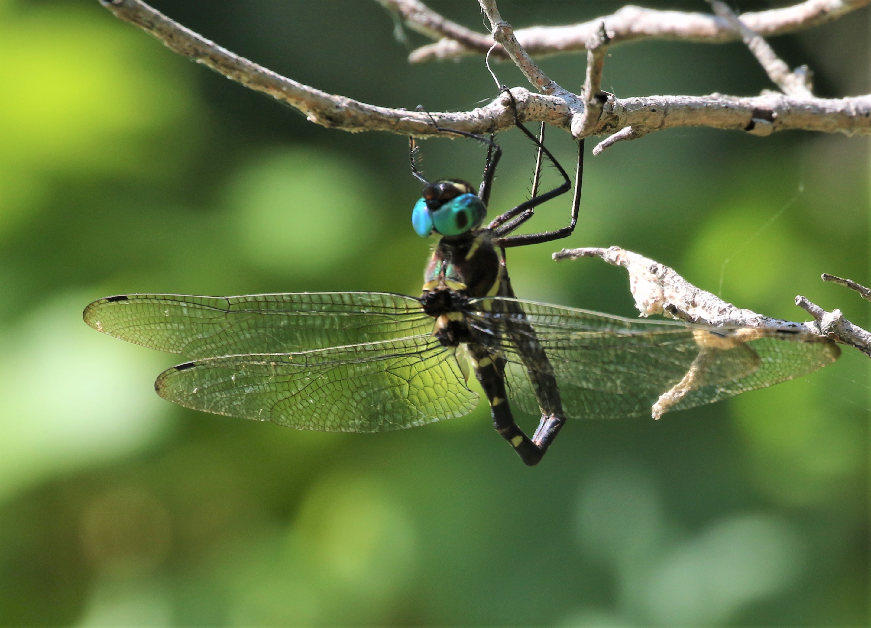 I started taking photos immediately, not knowing how long it would stay there. My first impression was that it was a Wabash river cruiser, a hard-to-photograph hybrid species. And indeed, that’s what it was! I couldn’t believe my luck, and took probably 70 photos of it, even though it barely moved. I always try to get multiple views of any dragonfly, because sometimes you need to see multiple field marks to confirm an identity. The diagnostic field mark on this species is the moth-shaped yellow mark near the end of the abdomen.