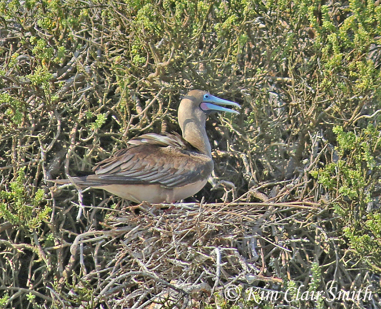 The red-footed booby is the only one to have several color morphs, and it’s also the one most likely to be found nesting in trees rather than on the rocks (at least I think that’s what our guide said). I was enchanted by the pink and blue coloration on the beak of this cartoonish bird and would have loved to have seen one up close instead of 75 feet above me on a cliff, as this one was.