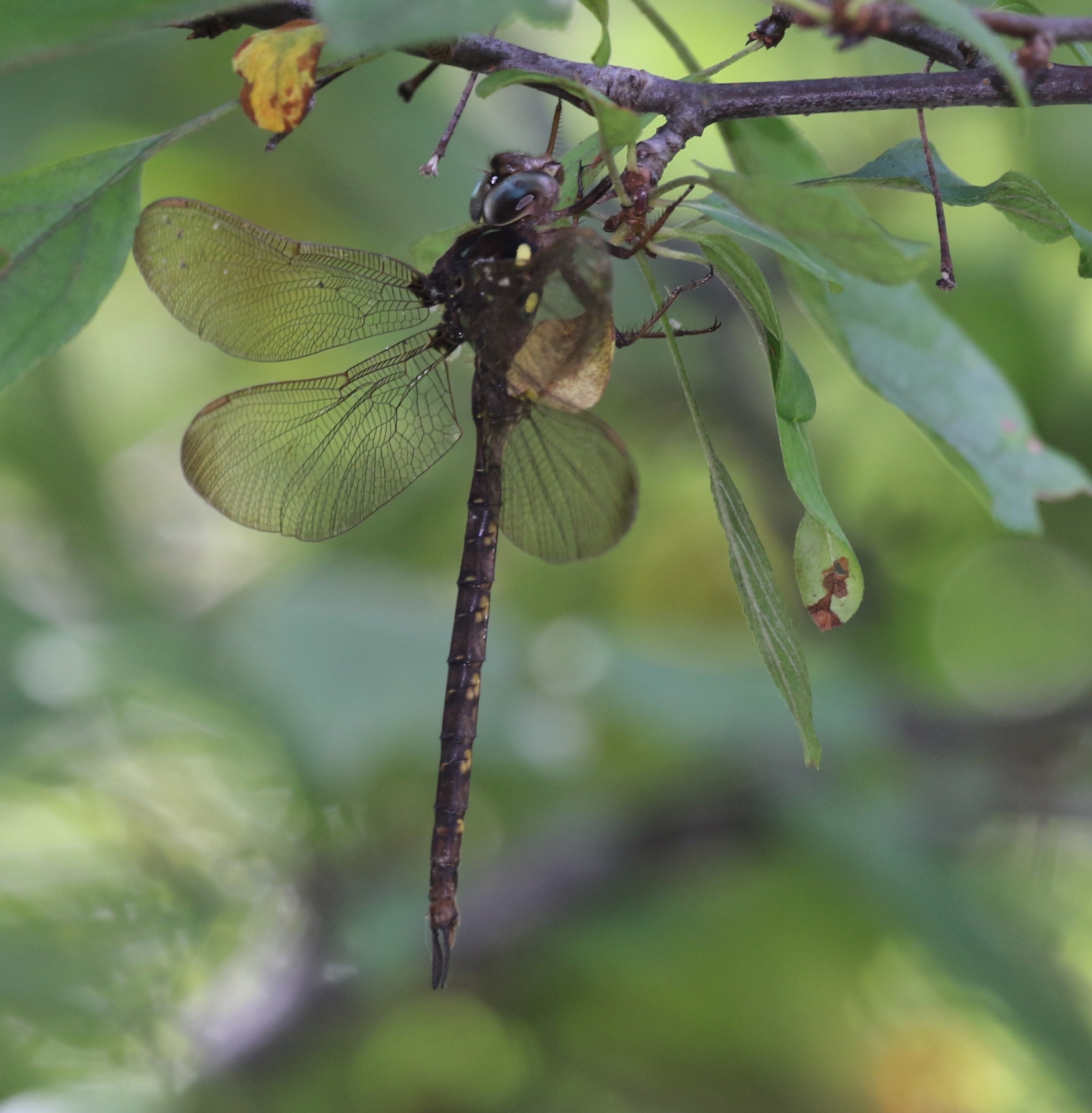 After standing around for a half hour or so, we almost gave up on this one. But then we started seeing some kind of dragonfly cruising low over the surface of the river, very fast and in an unpredictable pattern. It was moving in and out of shady areas, making it tough to get any photos to begin to nail down the identification. But as usual, we both clicked off as many shots as we could each time it went past us. It’s a frustrating process that usually results in lots of photos of blurry water or leaves. But persistence pays off, and we ended up with what we needed. These are still blurry, but good enough to identify this species.
