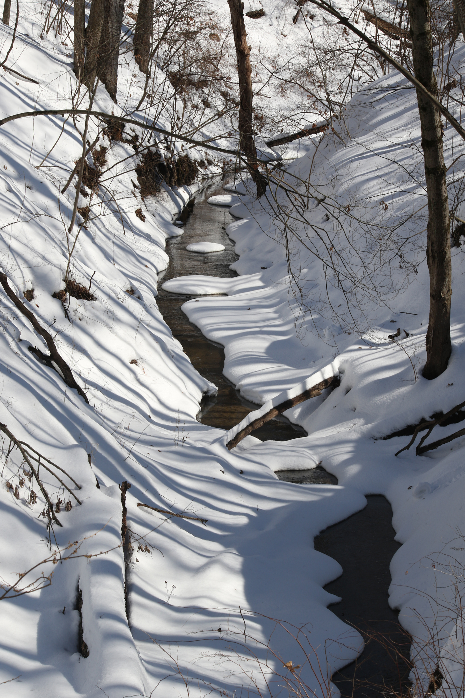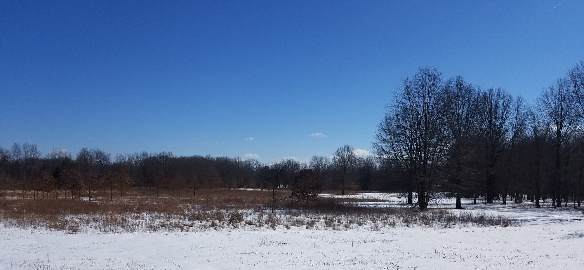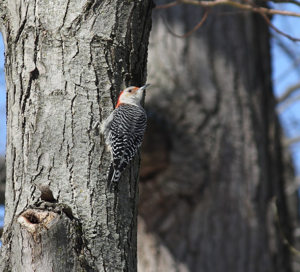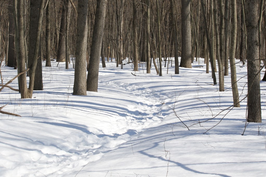 I headed a couple miles down the road to my nearest metropark, Wildwood Preserve. This popular Toledo park has many miles of hiking and biking trails. It can get crowded on nice days like today, so I headed into the woods where I knew the trails would still be snow-covered and that would discourage most walkers. And aside from an immortal 20-something who went fearlessly jogging past me in the uneven snow, there was hardly anyone out there. And I had a wonderful time. I walked slowly and stopped often to look for barred owls and pileated woodpeckers. Both of these species nest in this park, so there’s a decent chance of running into them if you spend enough time to listen and look.