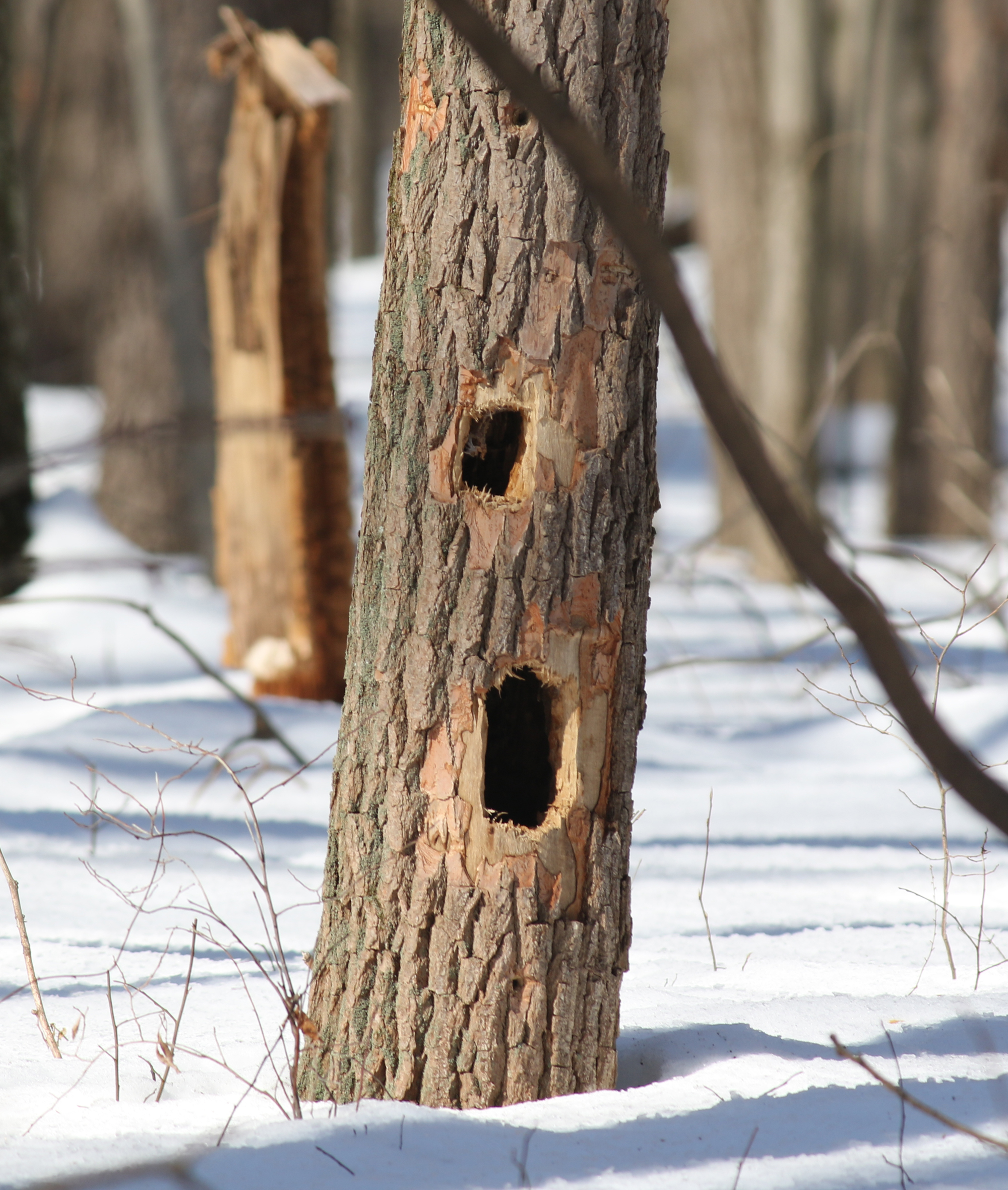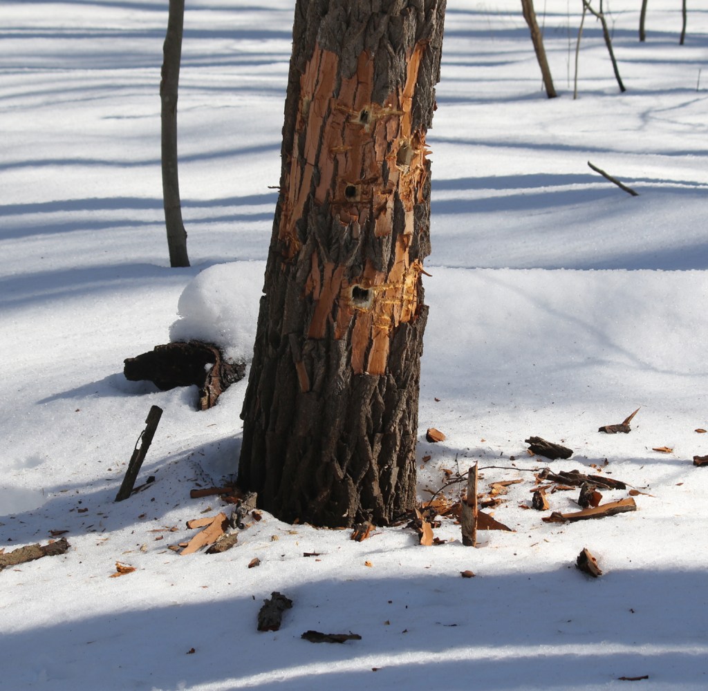 I didn’t find either of them today, but I found evidence of the pileated woodpeckers. These freshly-excavated holes appear to be slightly squarish, one of the signatures of a pileated woodpecker. Just a short distance past that first tree, I found some older holes that were definitely made by this species.