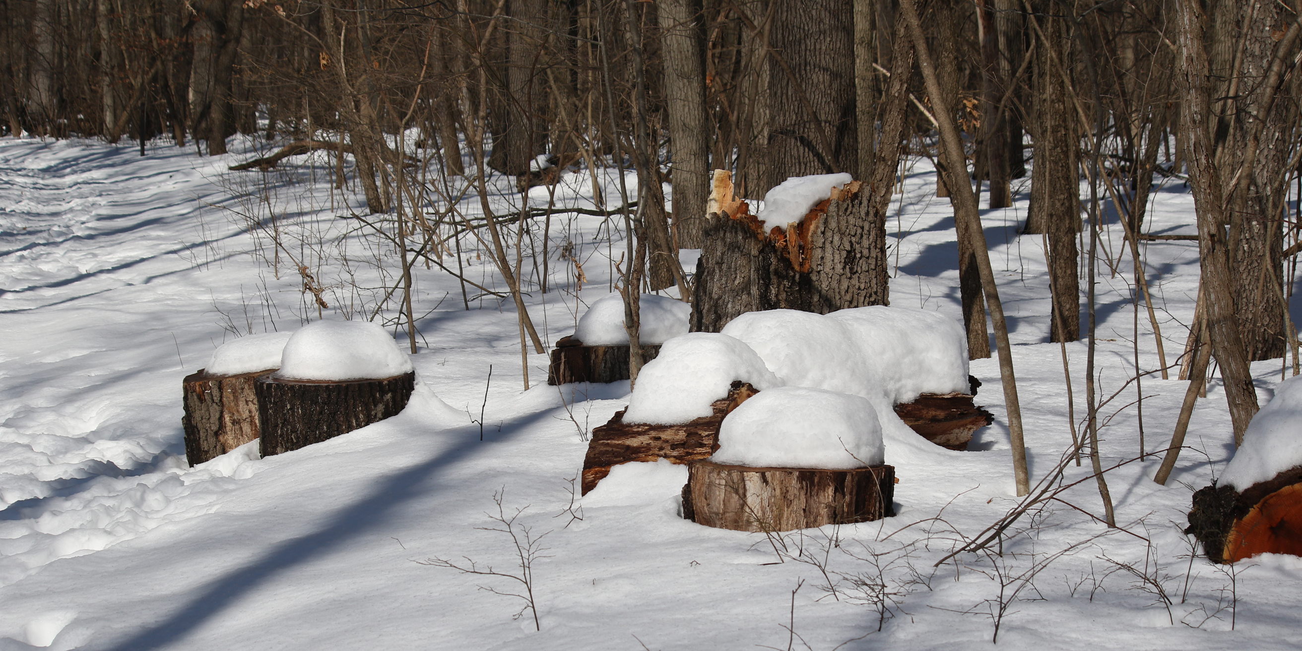 I came upon this scene, which I imagined to be fluffy snow cushions on tree stump chairs–perhaps in preparation for a meeting of the Woodland Critter Council?