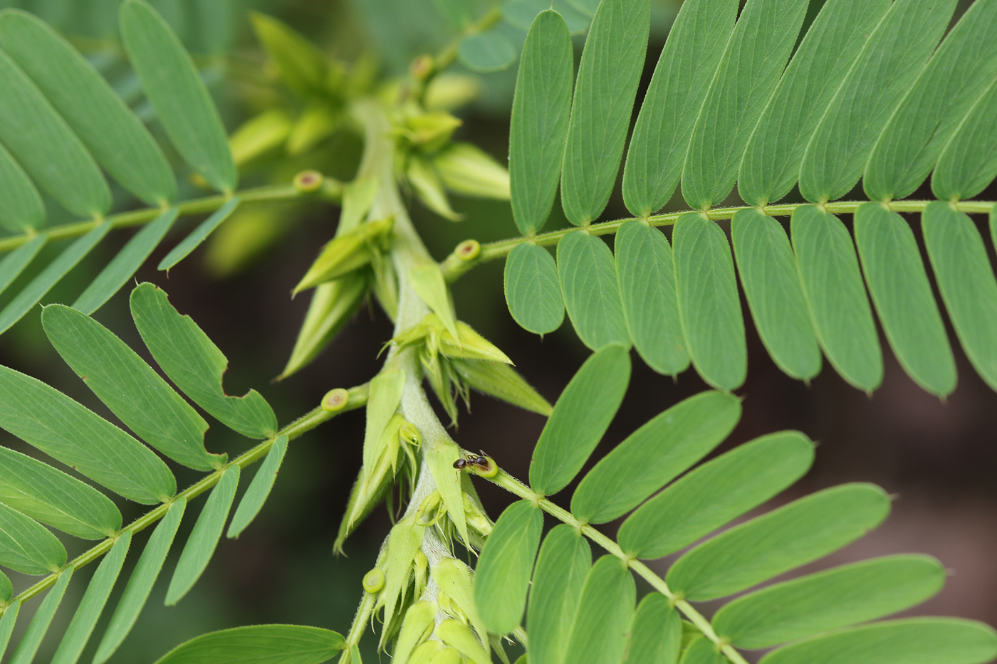 The flowers of most plants contain both pollen and nectar, so that the insects who visit for nectar will incidentally deposit pollen from other flowers they’ve visited, helping the plant to reproduce. But partridge pea flowers don’t contain nectar at all. The nectar is located separately, in little “extrafloral nectaries” located at the base of each leaf stem. They’re tiny little bowls of easily-accessible sweet stuff. Here’s an ant drinking from one of them: