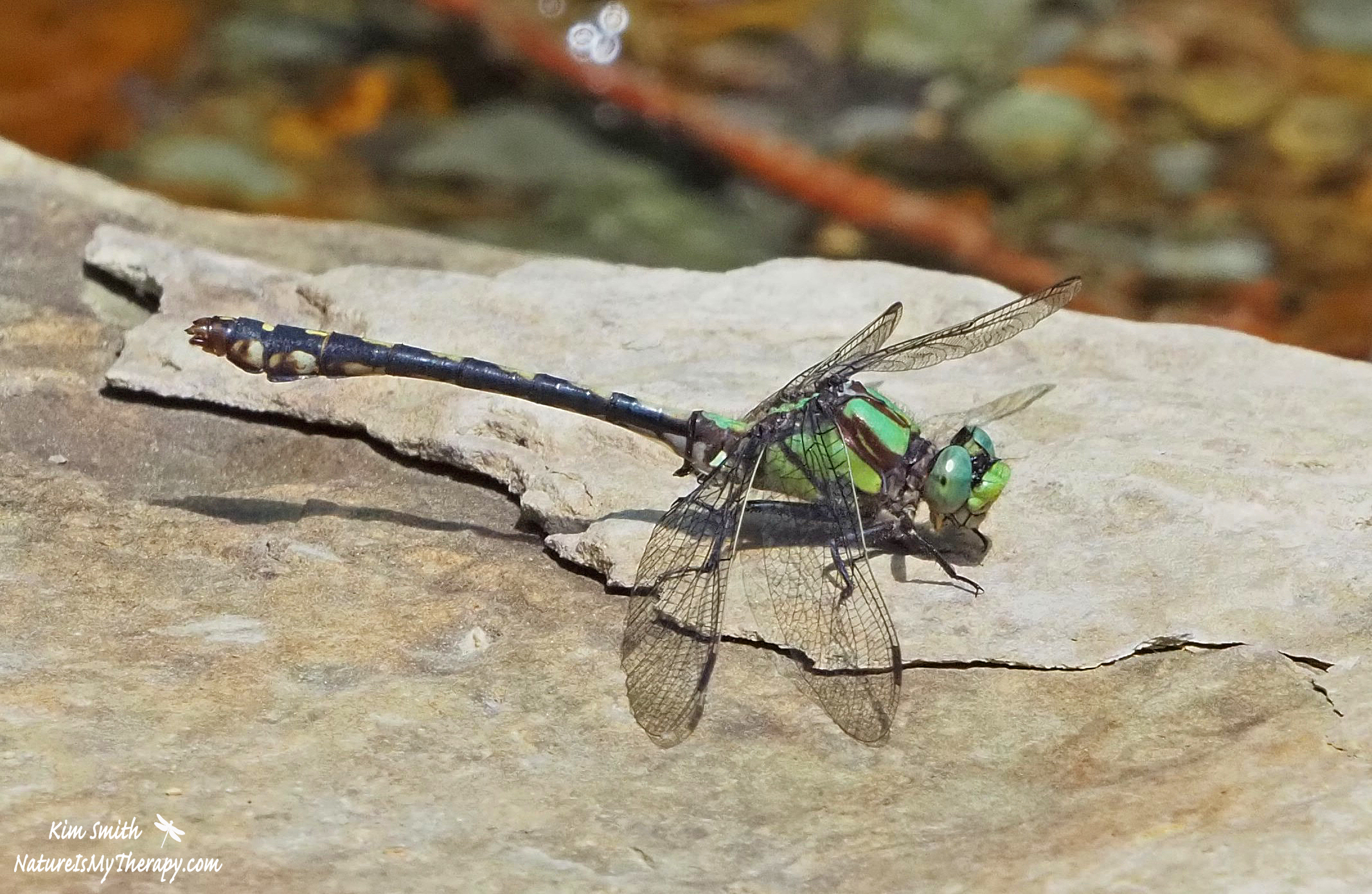 Even if you don’t care much for “bugs,” I hope you can appreciate this dragon for his beauty; we have many dragonflies with stunning blue and green eyes, but for overall color impact, this guy wins an uncontested gold medal among the Ohio dragonfly species. I spent about 20 minutes crouched down in the water taking as many photos as I could as he moved from rock to rock feeding on tiny flying insects. I took some video too, even though I have a hard time holding steady while I’m squatting on a rocky and wet surface. I hope you like it.