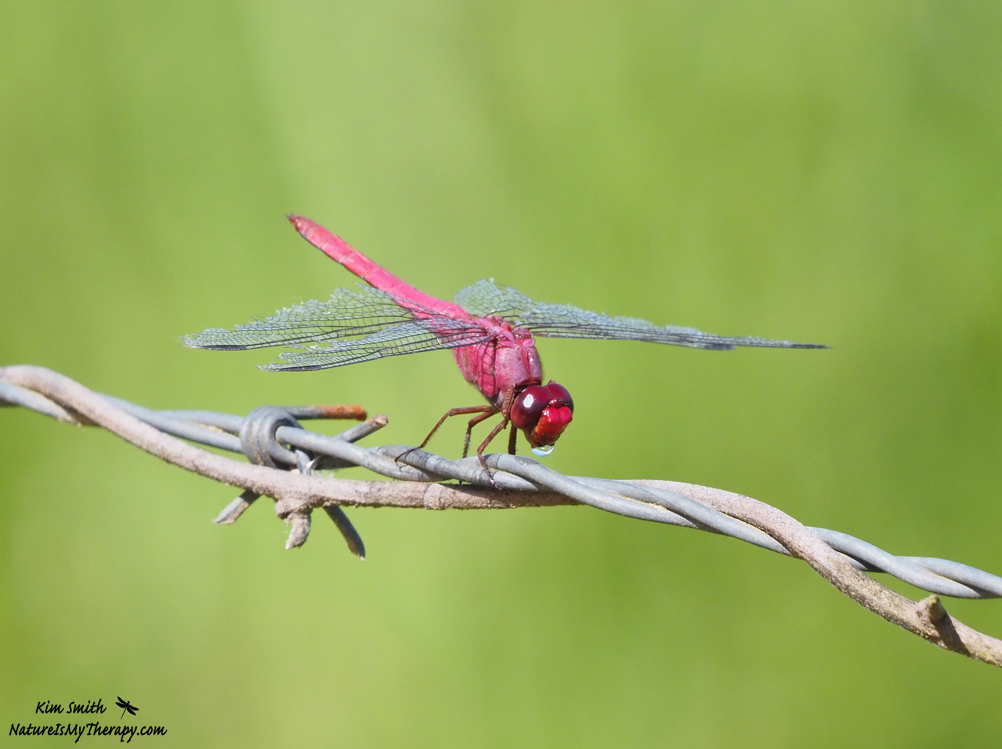 Carmine skimmer (Orthemis discolor), with water droplet.