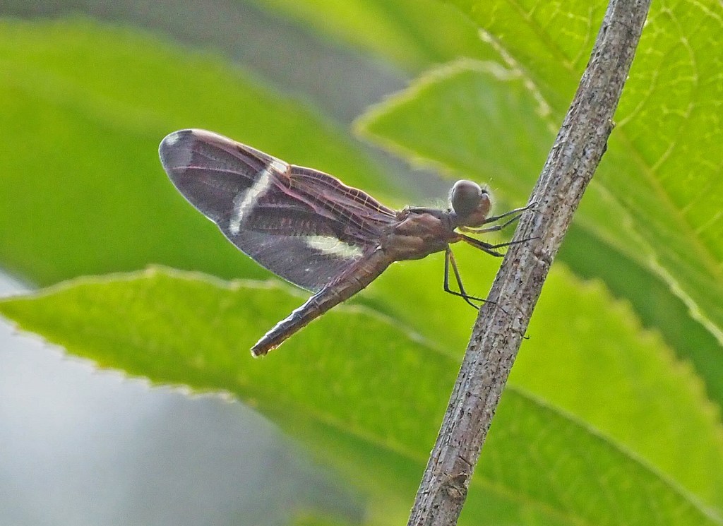 Bluewing? Yep, but the iridescent blue color only shows on the topside of the wings, and we only got underside views of the wings this time, which appear black. But I was thrilled to see it anyway. Males of this species are known to display by moving the wings up and down to flash the brilliant blue color, which might be what was happening in the second photo. Those of you who are interested in the science of their coloration might like to take a look at this study.