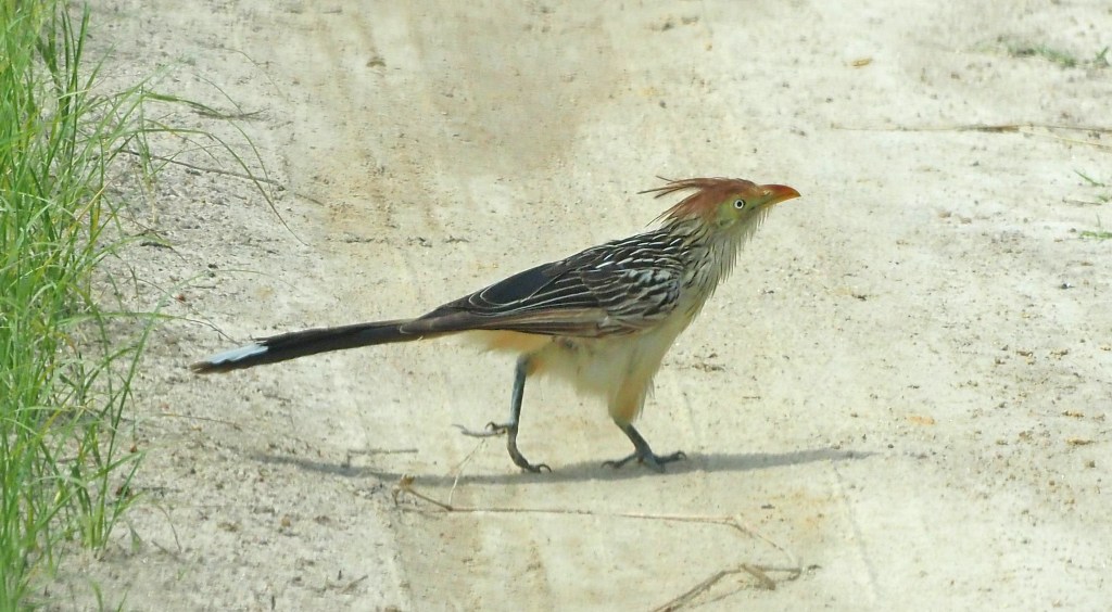 And finally, my favorite bird sighting of the trip was a trio of Guira Cuckoos. These are rather large birds of about 13″ in length, and they’re not known to be very skilled flyers, so perhaps that’s why I was able to see them so well. I first saw them foraging in a tree a short distance from the road as Alcenir was driving me. One of them dropped down to the ground and walked across the road in front of us, then flew up into another tree and posed for my camera.