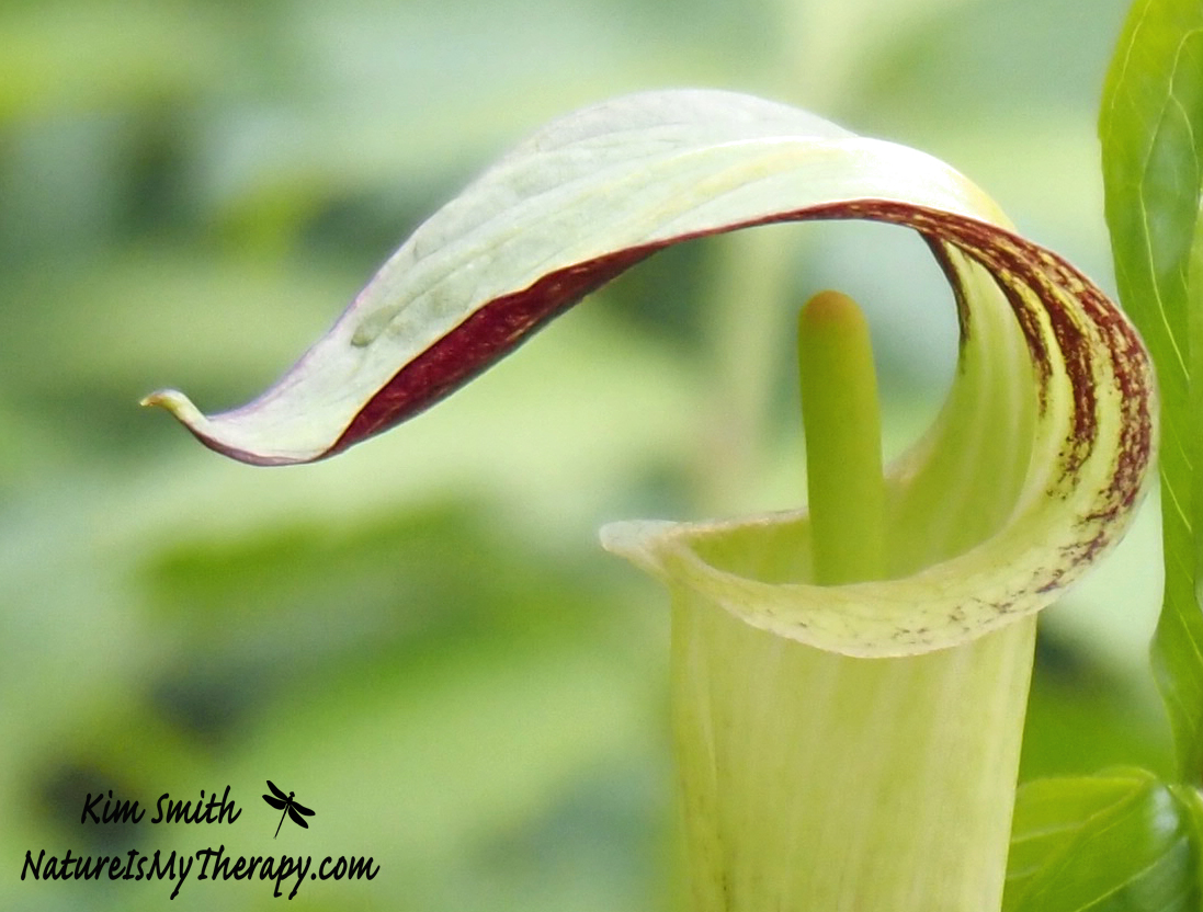 Another of my favorites among the spring flowers is Jack-in-the-pulpit (Arisaema triphyllum). Can you see him in there, standing in his ‘pulpit’? These upright plants can grow to two feet tall and are relatively easy to spot as they tower above everything else in the woods.
