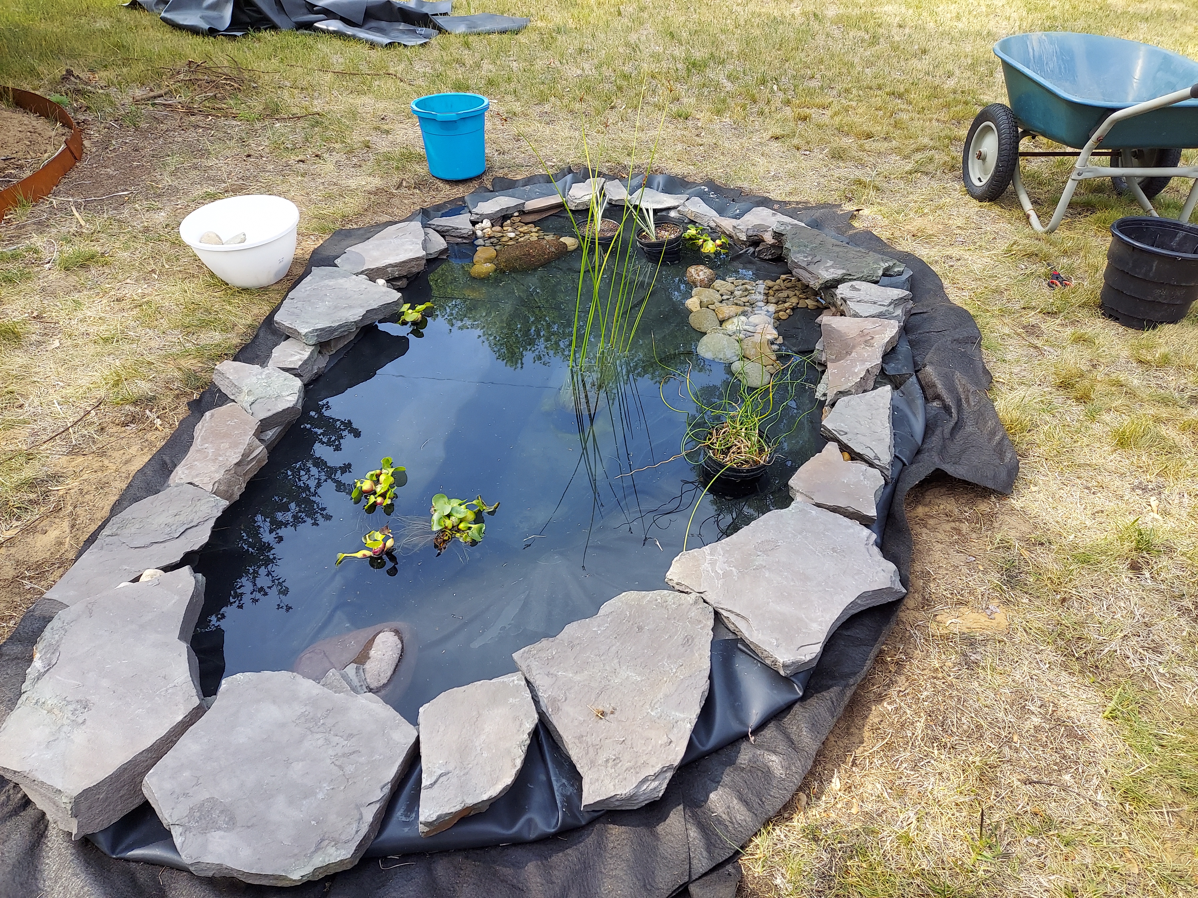 One thing I found when researching wildlife pond installations on YouTube was that most of the videos seemed to be from the UK rather than the US. And when I talked to the staff at our local pond nursery, they kept assuming I was going to have a waterfall, pump, and filtration unit; they seemed confused by my idea of a wildlife pond. Apparently most Americans prefer to put fish in their ponds, requiring pumps and mechanical filtration. If I’ve done my research properly, my fishless pond water will be filtered adequately by the plants, along with added beneficial bacteria occasionally (I still have to read more about that). I’ll do regular skimming of floating debris to help keep it clean, and I know I’ll have to do more intense cleaning of the pond periodically, depending on how quickly it gets gunked up.