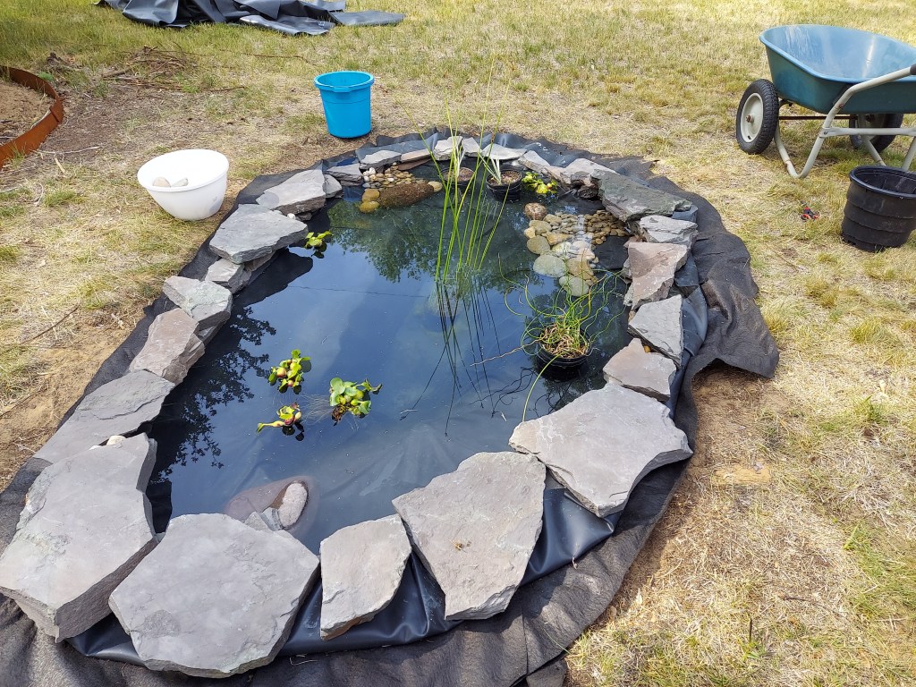 One thing that caused me some confusion in my research was coming across one video from a pond company that said that adding rocks to your pond was a MAJOR mistake because it increased the difficulty of keeping it clean. But that idea got a lot of pushback in the comments, and most other instructional videos do include rocks in the ponds. I haven’t done it yet, but I think I’m going to add some medium-sized river rocks to the bottom of my pond. I don’t like looking at a plain black liner under the water, and I think rocks would give so much more interest and provide places for aquatic critters to live. And since my pond is relatively small, I can easily pull rocks out to clean them if necessary.
