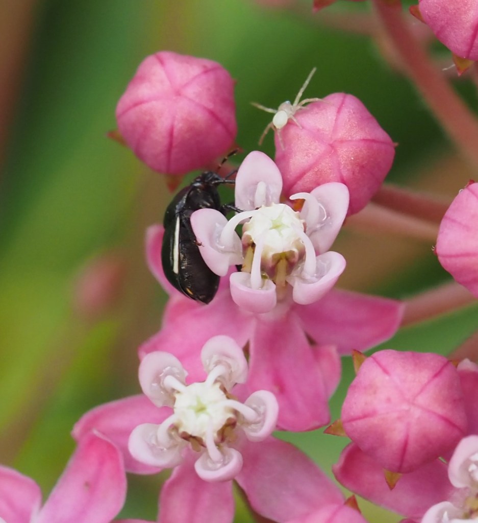 I didn’t get good photos of everyone, but in only ten minutes I saw a dozen species of arthropods on this single swamp milkweed plant: 1 beetle, 1 true bug, 1 spider, 1 butterfly, 3 wasps, 2 bees, 2 flies, and 1 species of ants (maybe more, they move fast and I rarely try to photograph ants). If it hadn’t been so windy I would have stayed longer and most likely documented more species. These Micro Nature Study sessions are a wonderful way to pay attention to the diversity of species in the garden. Maybe you should try it in yours and let me know what you find!