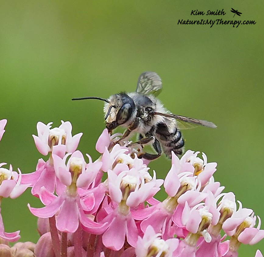 Among the critters who come to feed and breed on milkweed are bees, wasps, beetles, ants, flies, and spiders. This very hairy leafcutter bee seems almost cuddly.