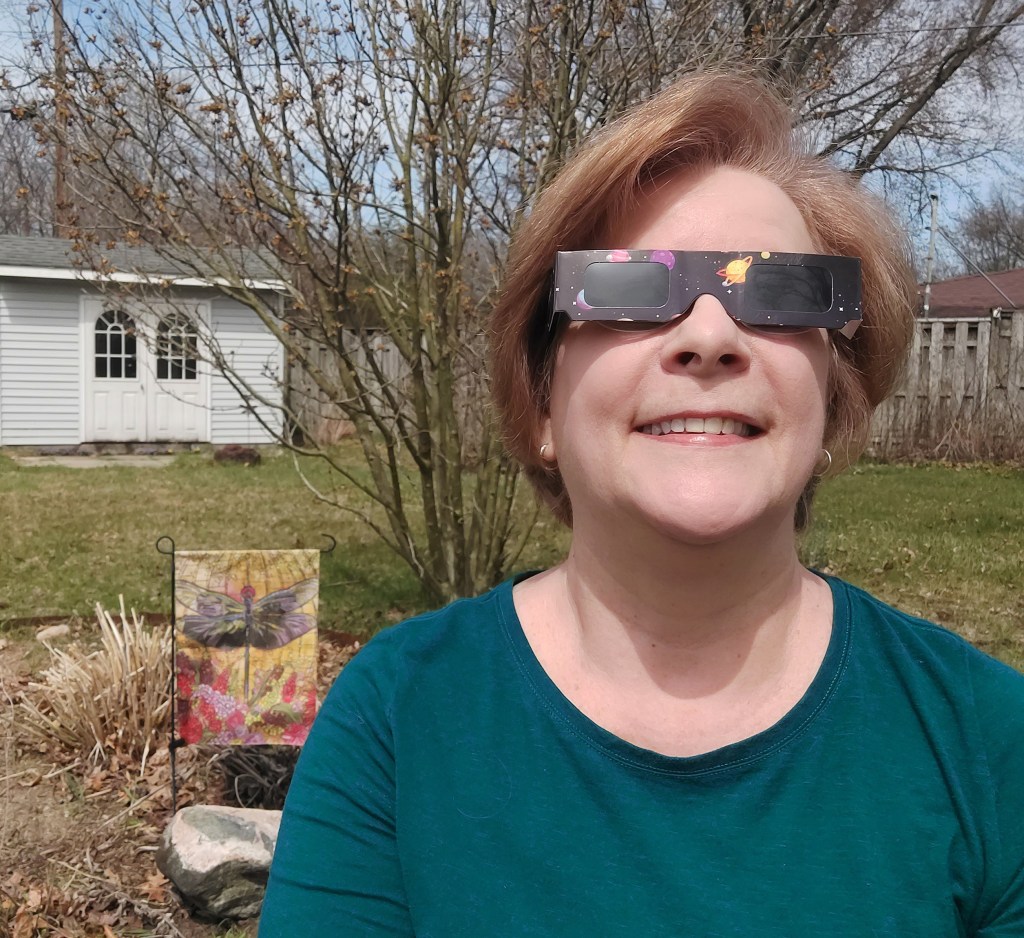 1. My partner and I traveled to Bloomington, Indiana to see the eclipse. I had made hotel reservations a year in advance! We gathered with a small crowd in a park where bands were playing before and after the event. We experienced a little over three minutes of totality and I will never forget it. I was so moved I was crying. I didn’t expect that but welcomed it. Venus and Jupiter were also visible during totality in the same field of view as the eclipse. I don’t yet have the words to accurately describe this event!