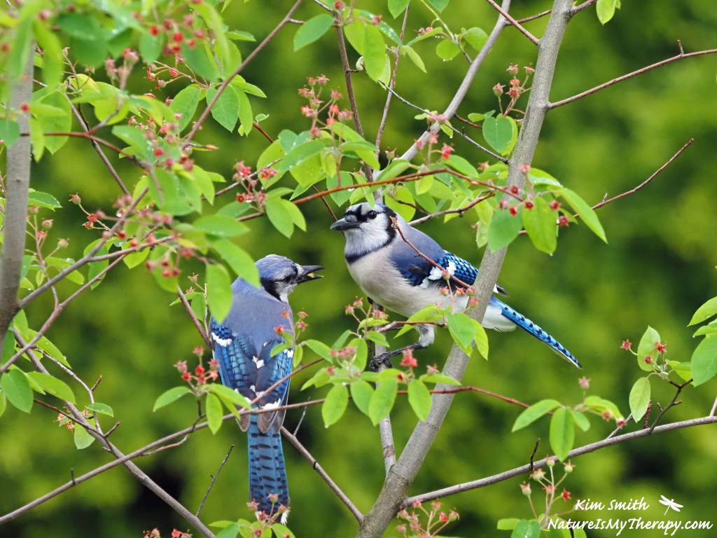 Some blue jays hung out in one of my serviceberry bushes the other day. There were four of them at one point, and these two were sharing food with each other. They’re such common birds here that I sometimes forget how stunningly beautiful they are!