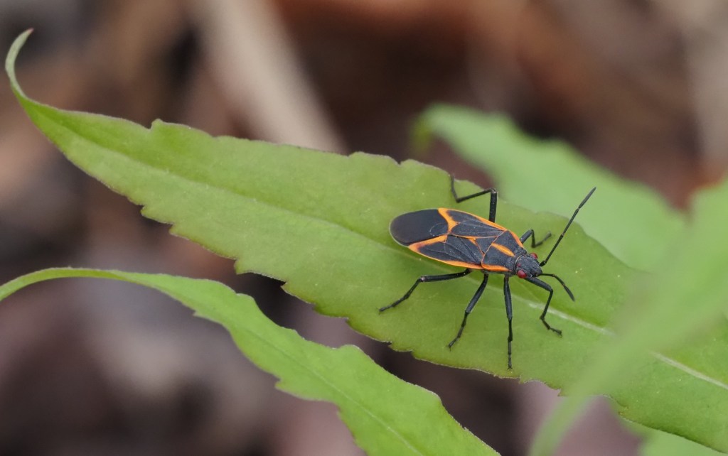 Let’s end today with a lovely bug, shall we? This is a gorgeous Eastern boxelder bug — look at his red eyes and striking wing pattern. They’re true bugs who feed on the sap of maple trees, and I’ve got two of those, so I always have large numbers of this species. Today I rescued one out of the bird bath, less than an hour after I filled it for the first time. I told him to be more cautious around large bodies of water, and released him on the ground nearby. That’s one thing that I didn’t expect when I made my pond: the frequent drownings of insects there. I’ve provided lots of ways for bugs to get out of the water, but I still find a surprising number of them floating dead on the surface. I guess that happens all the time in “unseen nature,” so whenever you bring nature closer to home, you’re bound to see the sad parts as well as the joyful parts.