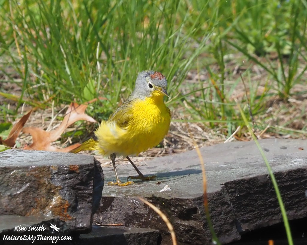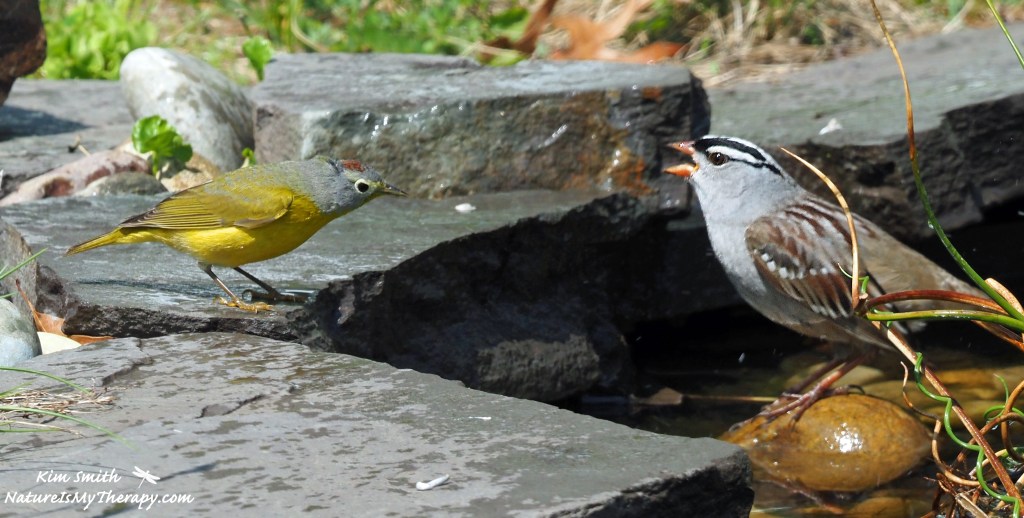 Water is another important resource for wildlife, and my pond is bringing rewards aplenty right now as well. Today I was thrilled to watch a Nashville warbler and a white-crowned sparrow sharing the pond for bathing and drinking. After they left, a brown-headed cowbird jumped in the water and splashed around. And American robins have been bathing in the pond nearly every day for the past month or so.
