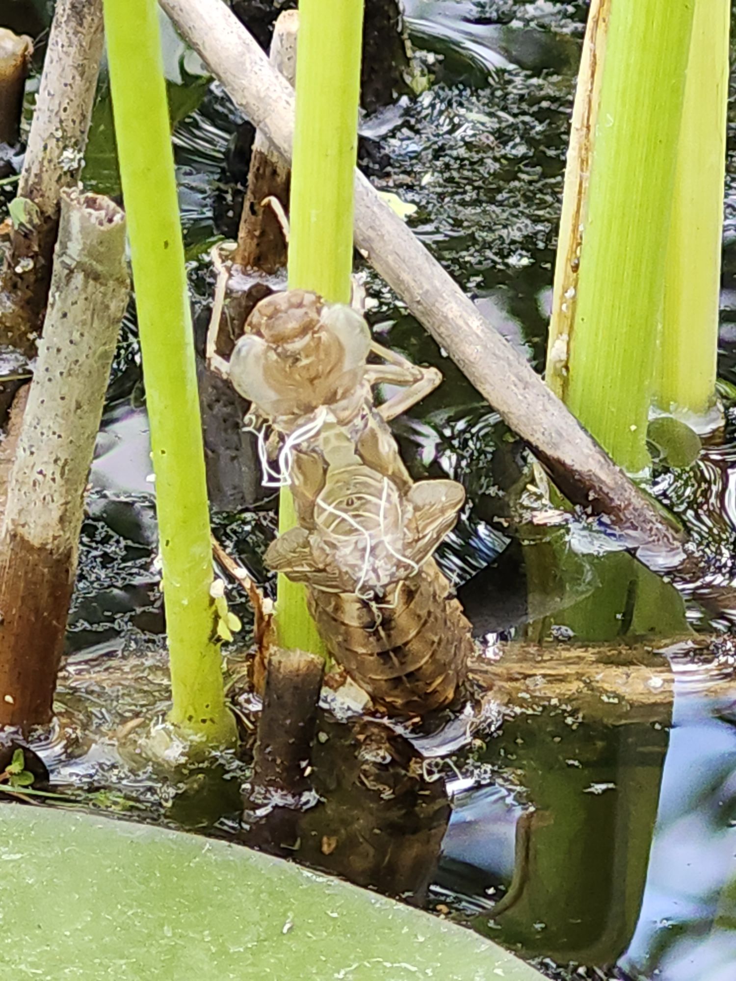 I continue to find new species of dragon- and damselflies in the garden, and found three or four new species in one week in late May. So far I’ve documented 16 species here, and definitely more activity since I built the pond. I found this evidence of a green darner emergence in the pond a few days ago, but sadly didn’t get to see the adult before it flew away.