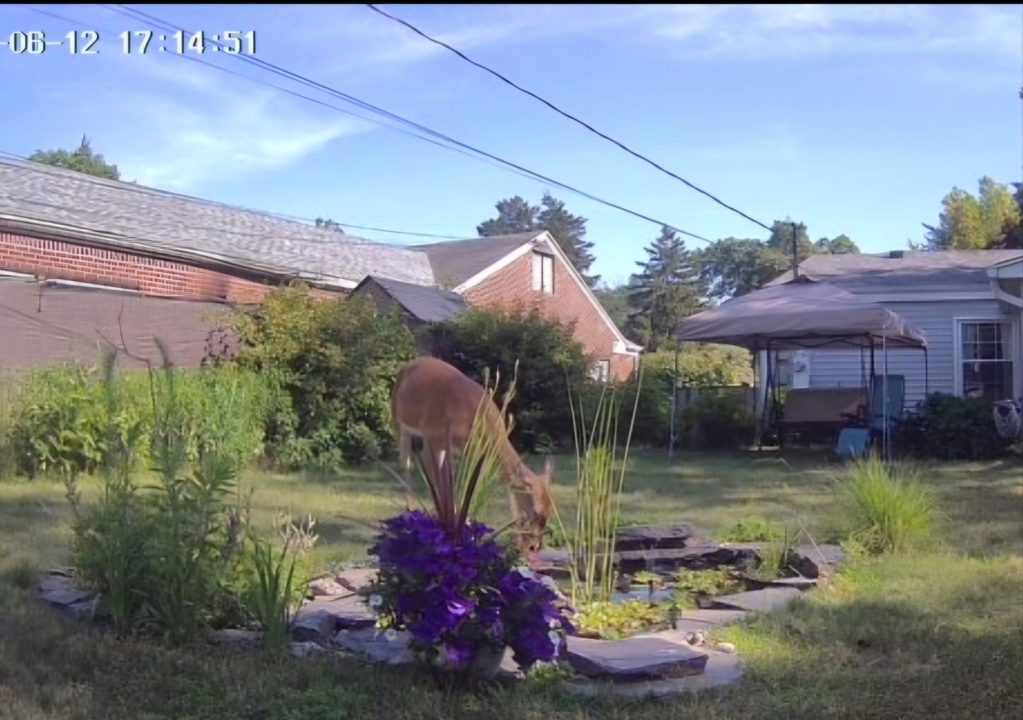 When I wrote about my new battle with deer in May, I also mentioned that I was/am considering building a second pond. I laid out a rope outline and moved it each day as I watched to see if it would get enough sun for the pond plants. I finally settled on the location, and then the deer came back. My security camera photographed her drinking from the pond at 5:00 in the afternoon, an unusual time for deer to be moving around in the neighborhoods. And now that we’re in the midst of a record-breaking heat wave, I’m expecting to see the deer again and again. So I’m second-guessing the idea of adding yet another pond to make my yard even more enticing to them. I think I need a second camera to point at the fence to figure out where they’re getting through. I put up the rope “psychological deer fence,” (described in the May post) but I didn’t extend it the entire length of the fence because I thought some large shrubbery along the rest of the fence would deter the deer. It didn’t. Clearly, I’m gonna need more rope. (I can’t help hearing that in the voice of Chief Brody in Jaws — “You’re gonna need a bigger boat!”)