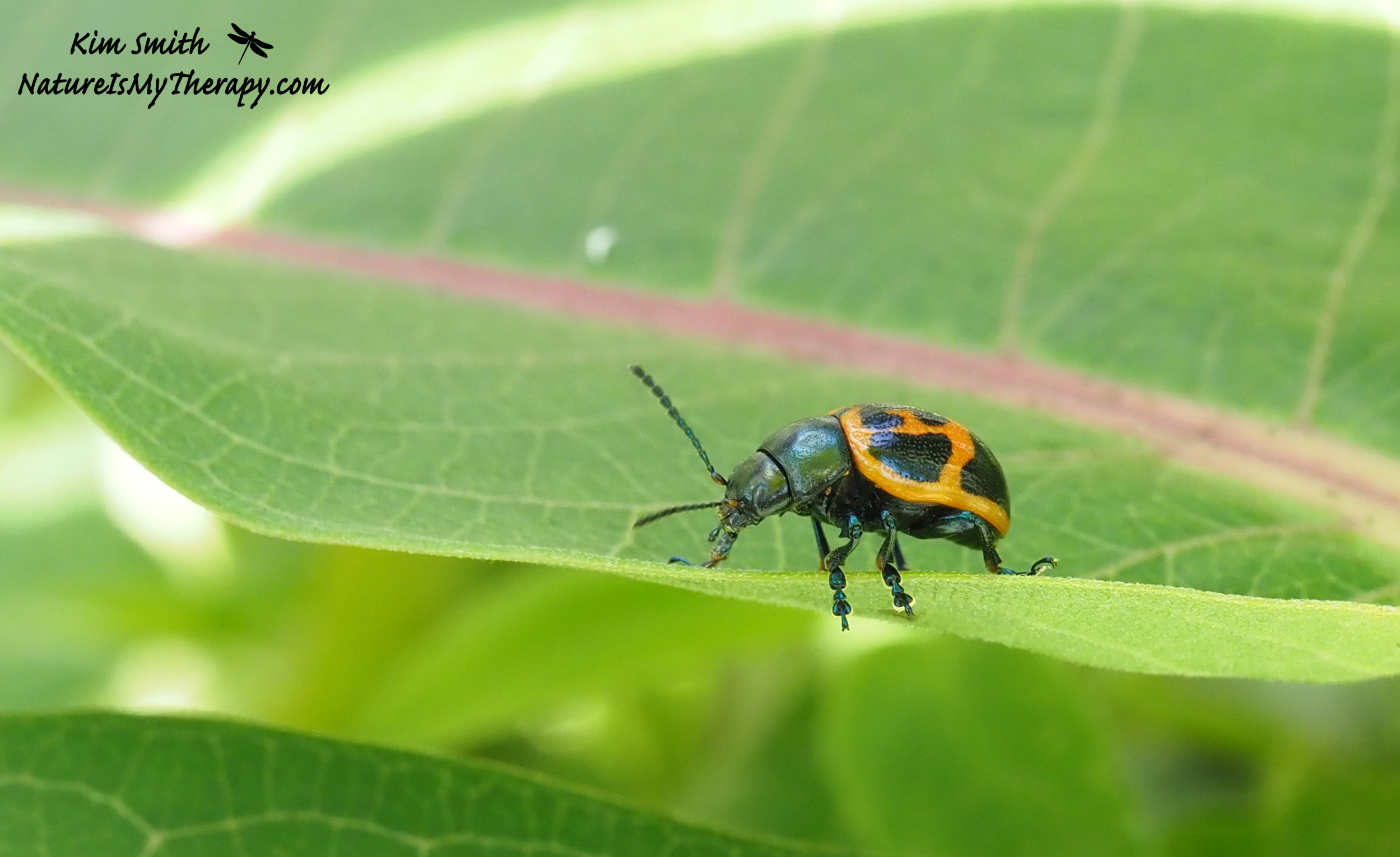 Like other insects that specialize on toxin-containing milkweeds, this swamp milkweed leaf beetle is wearing the aposematic colors that warn predators of a nasty tummy upset that awaits if they dare to eat it. Think of the orange and black monarch butterfly, and the orange and black large milkweed bug, and the red (and black) milkweed beetle shown at the top of this post. Only a young or color-blind animal is likely to taste these, and probably only one time. It’s a fascinating survival mechanism, isn’t it?