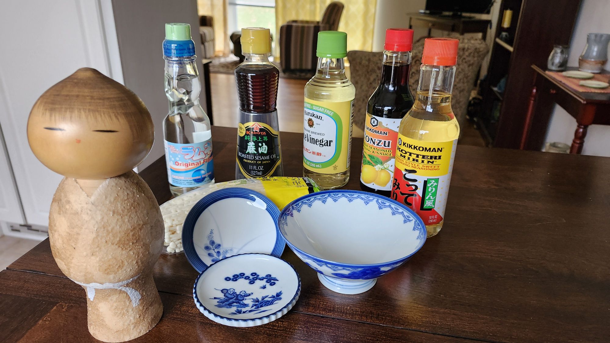 With that in mind, I went to a large Asian grocery store (Kirin Asian Mart) in my neighborhood today and stocked up on the vinegars, oils, and other ingredients that I’ll need to make some of the simpler dishes. This photo shows a few of the items I purchased today. It also shows a few of my beautiful little dishes and one of my favorite kokeshi dolls.