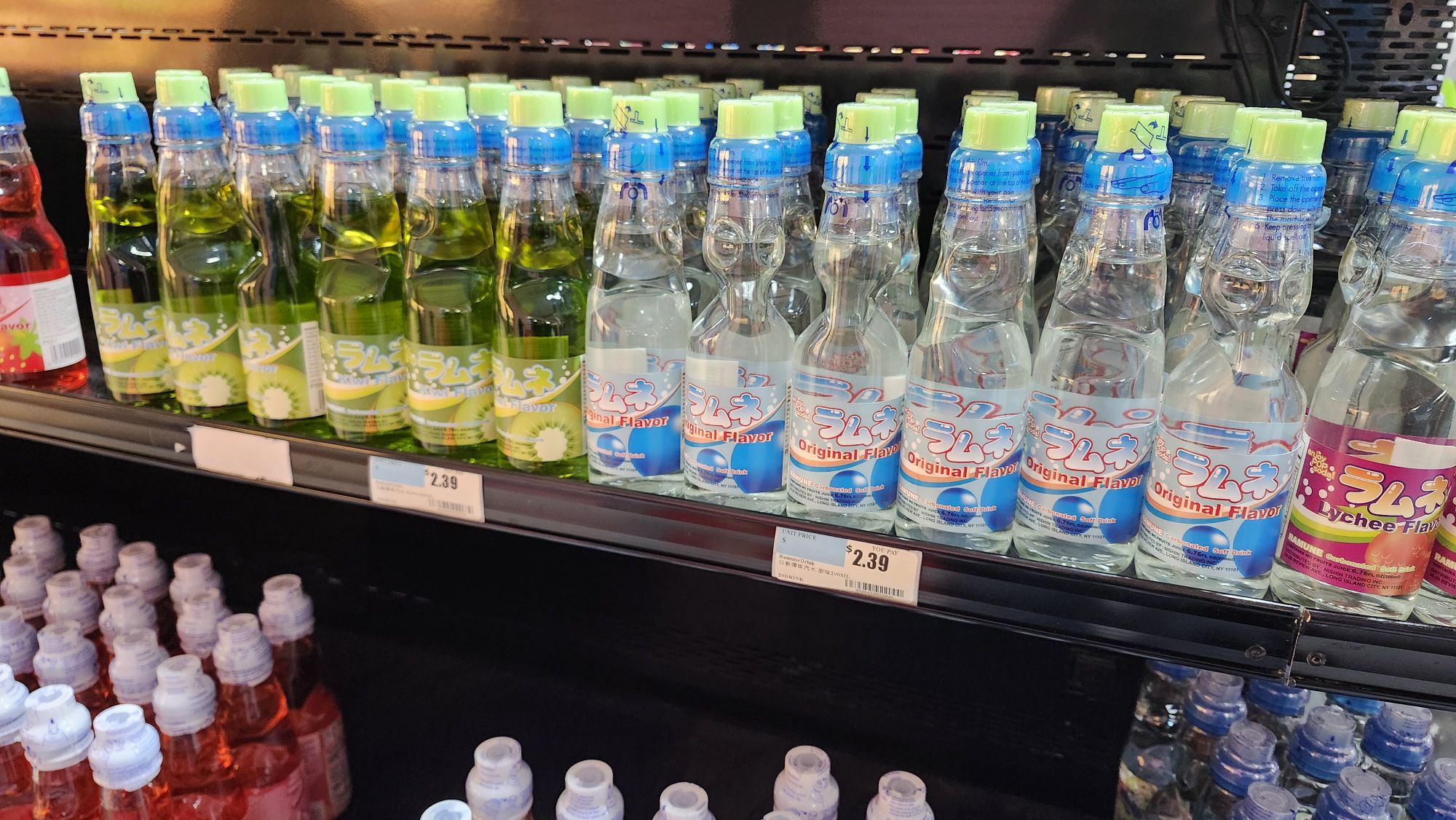 And I was overjoyed to find bottles of Ramune (ラムネ), a carbonated soda similar to Sprite that has a fascinating bottle design. There’s a marble inside to seal the bottle, and when you unseal it, the marble drops down to the pinched section of the bottle and clinks around in there as you drink your soda. Wikipedia explains the history of this type of bottle if you’re interested in clicking over there for a moment. And you can listen to the pronunciation of the word ラムネ in the Japan Dictionary, here. It comes in many flavors now, but I bought the original one that I remembered. It’s far too sweet for me to enjoy often, but it was fun to have one today.