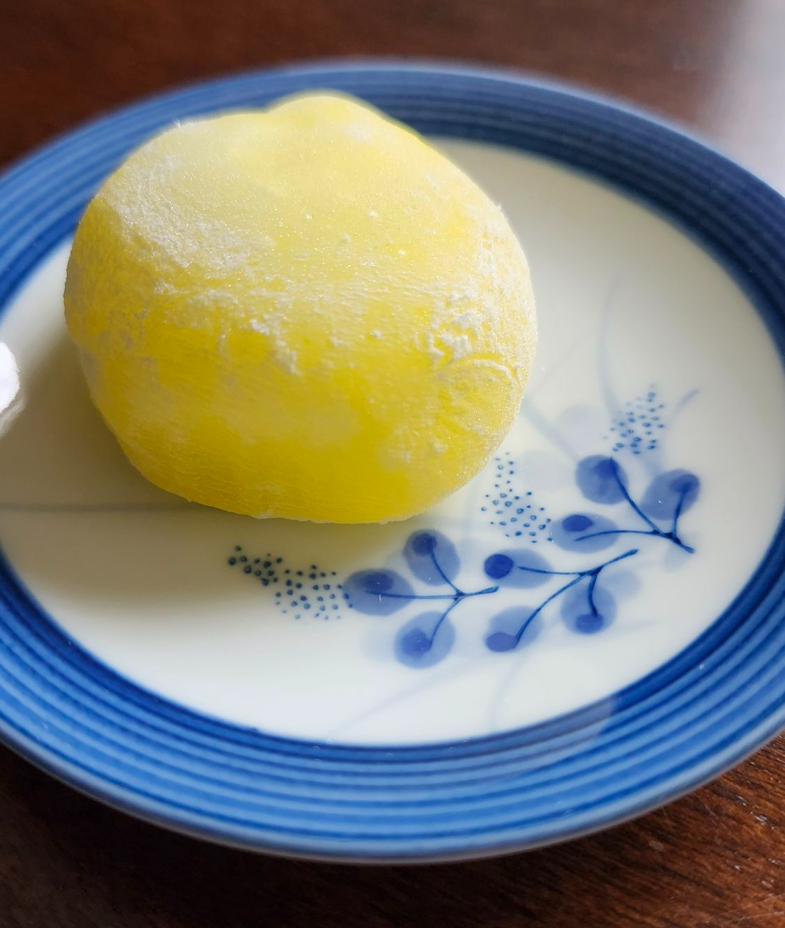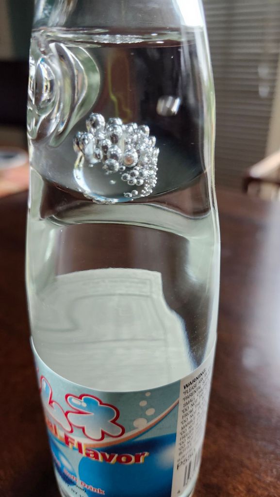 Here’s my bottle after I used the cap tool to push the marble down, resulting in a strong pressure release – THUNK! I love how the marble is covered with bubbles of carbon dioxide at first. I’m enjoying my Ramune right now with a delicious lemon rice cake (daifuku mochi). I feel transported by these flavors and memories, and this is exactly what I need in this moment.